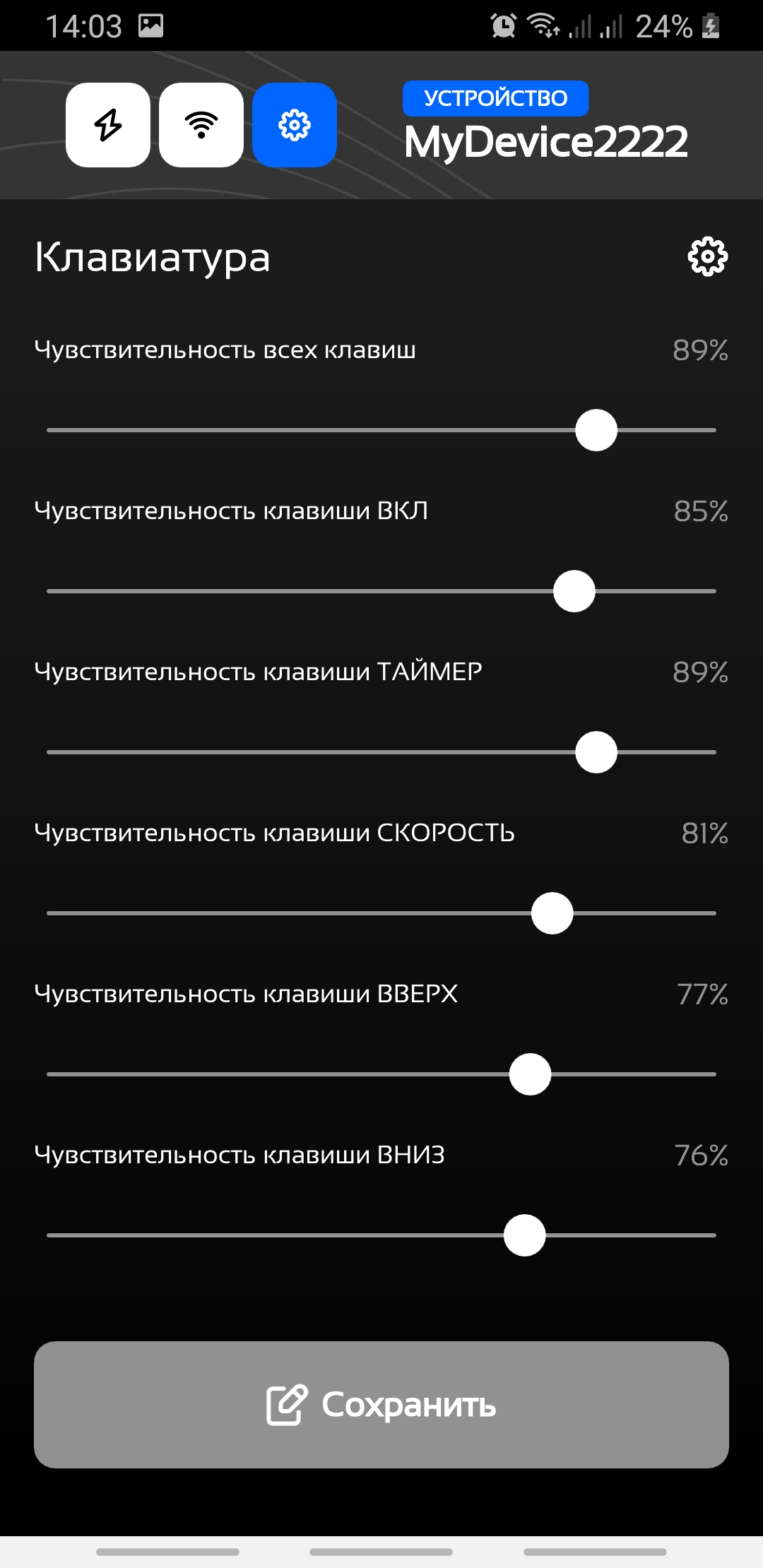 В этом разделе задается чувствительность кнопок панели. Для каждой кнопки можно задать индивидуальное значение чувствительности. При использовании ползунка Чувствительность всех клавиш значение чувствительности будет меняться у всех клавиш синхронно.